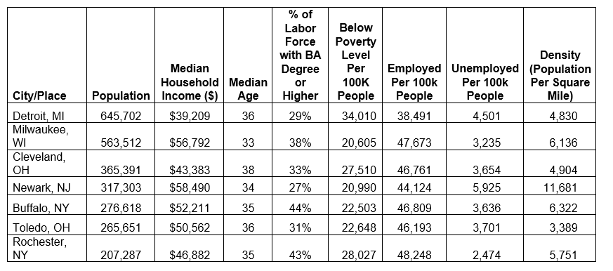 — The Research Council selected peer cities based on objective criteria that influence crime in urban areas, including large population size, low median household income, prevalent poverty, and low employment. Detroit’s six peer cities for comparison on crime trends are Milwaukee, Newark, Buffalo, Rochester, Toledo, and Cleveland.