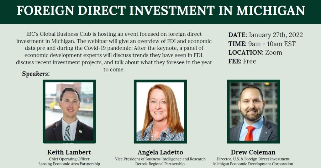 IBC’s Global Business Club is hosting an event focused on foreign direct investment in Michigan. The webinar will give an overview of FDI and economic data pre and during the Covid-19 pandemic. After the keynote, a panel of economic development experts will discuss trends they have seen in FDI, discuss recent investment projects, and talk about what they foresee in the year to come.