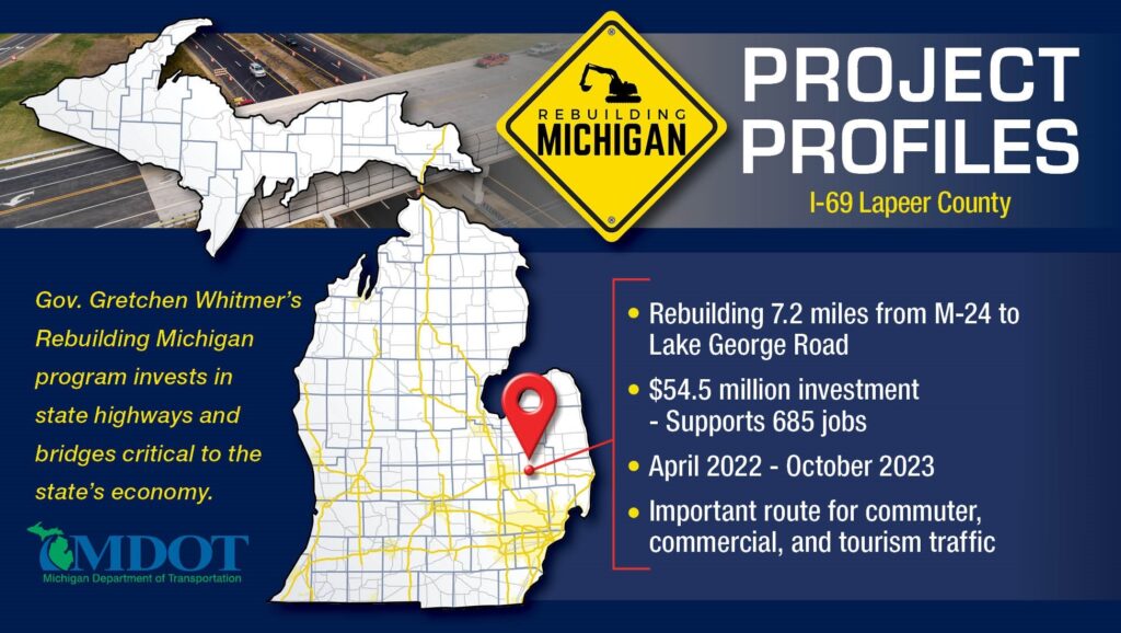 I-69 Rebuilding Michigan in Lapeer County MDOT will invest $54.5 million to rebuild more than seven miles of I-69 from M-24 to Lake George Road. This work will also replace the Five Lakes Rest Area. Based on economic modeling, this investment is expected to, directly and indirectly, support 685 jobs.
