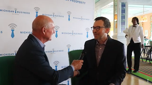 Chris Holman speaks with Ryan Duffy, Corporate Communications & Media Relations Strategist, Enbridge, from Media Row, at the Grand Hotel, while at the 2022 Mackinac Policy Conference.
