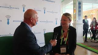 Chris Holman speaks with Michele Wildman, Executive Vice President for Economic Development Incentives, MEDC, from Media Row, at the Grand Hotel, while at the 2022 Mackinac Policy Conference.