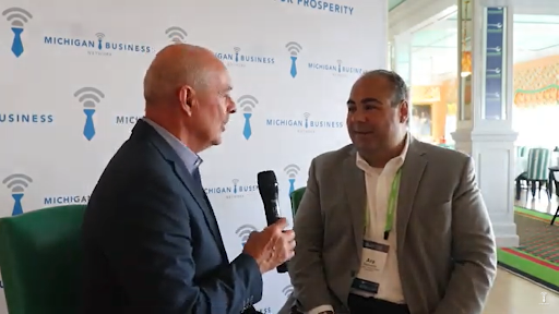 Chris Holman speaks with Ara Topouzian Executive Director MVCA – Michigan Venture Capital Association, from Media Row, at the Grand Hotel, while at the 2022 Mackinac Policy Conference.