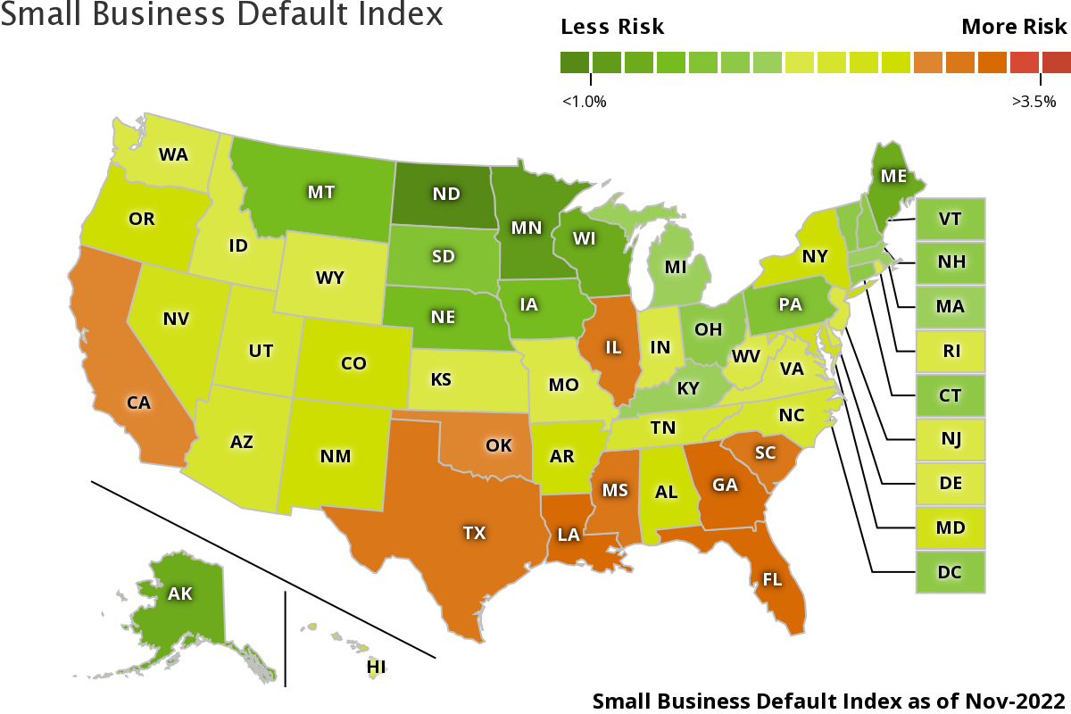 Small Business Default Index • The percentage of loans and leases that defaulted in the last 12 months is 2.01%, a slight decrease. • The default rate is lowest in North Dakota at 1% of loans, Minnesota at 1.09% of loans, and Alaska at 1.26% of loans. • The highest default rates can be seen in Florida (2.69%), Georgia (2.65%), and Louisiana (2.51%). • On average, southern states have a higher risk of defaulting while northern states have a lower risk of default. |