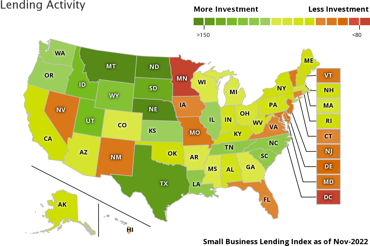 Small Business Lending Index • The volume of new leases and commercial loans decreased by 1%. • Small business lending activity was the lowest in Minnesota and Washington D.C. towards the end of 2022. • Montana, North Dakota, and Nebraska had the highest small business investment in their states compared to other states in the country. |