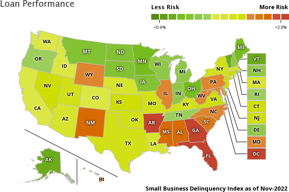 Small Business Delinquency Index • The percent of loans that are more than 30 days past due but less than 91 days past due is 1.39%, a slight increase. • Delinquencies are highest in Washington D.C. (4.85%), Georgia (2.16%), Florida (2.14%), and Arkansas (2.13%). • The lowest delinquency rates are in Alaska (0.64%), Vermont (0.77%), Maine (0.86%), and Minnesota (0.87%). |