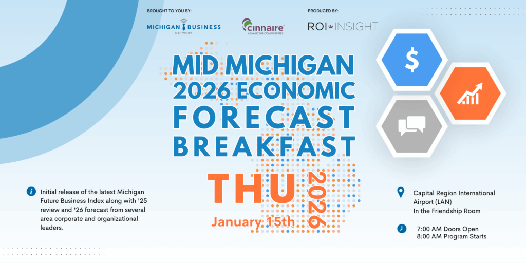 Join the Michigan Business Network and community leaders for the annual 2026 Economic Forecast Breakfast on Thursday, January 15th. The 2026 Economic Forecast for Mid-Michigan is one of the most anticipated economic forecast events in our community.
